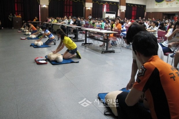 경기 군포소방서는 지난 21일 군포시청 대회의장에서 1000여명을 대상으로 2013년 을지연습과 제392차 민방위 날 훈련을 연계해 심폐소생술 교육을 했다. 사진은 모형인형을 가지고 심폐소생술을 배우고 있는 모습.