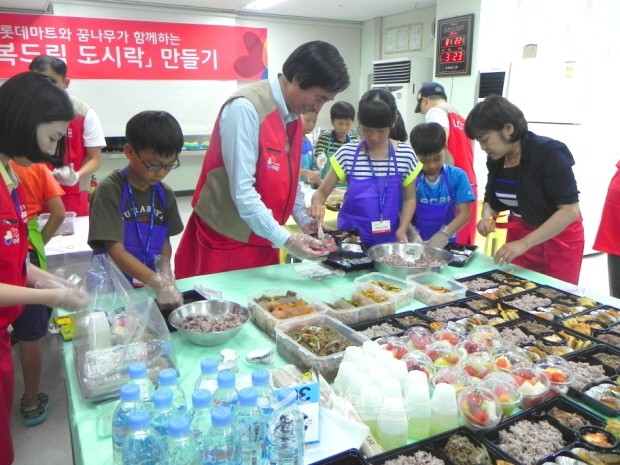 [시민일보]지난 22일 롯데마트 직원들과 지역 어린이들이 저소득층 100여가구에 직접 만든 도시락을 각 가정에 방문해 전달했다. 사진은 어린이들과 롯데마트 직원이 도시락을 직접 만들고 있는 모습.