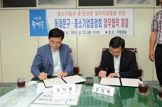 ▲ 23일 유덕열 동대문구청장은 중소기업중앙회와 ‘중·장년층일자리 창출을 위한 업무협약’을 체결했다.사진은 유덕열 구청장(왼쪽)이 중소기업중앙회 김제락 인력지원본부장(오른쪽)과 업무협약을 체결하고 있는 모습.