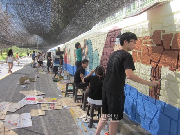 [시민일보]지난 25일 고양시 일산서구 일산1동 주민센터에서는 화정C&C미술학원 관계자 및 고양예고 담쟁이 동아리팀 자원봉사자들 약100여명이 참여한 일산1동 태영아파트 벽화그리기 작업이 완료되었다. 사진은 고양예고 담장쟁이 동아리팀이 벽화를 칠하고있는 모습.