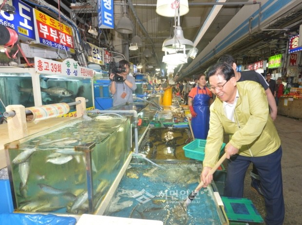 지난 27일 동작구가 노량진 수산시장에서 문충실 동작구청장과 구 직원 100여명과 함께 일본 후쿠시마 원전사고 지역의 오염수 유출소식에 큰 어려움을 겪고 있는 수산시장 상인들을 위한 수산물 시식행사를 가졌다. 사진은 문 구청장이 횟감을 고르고 있는 모습.