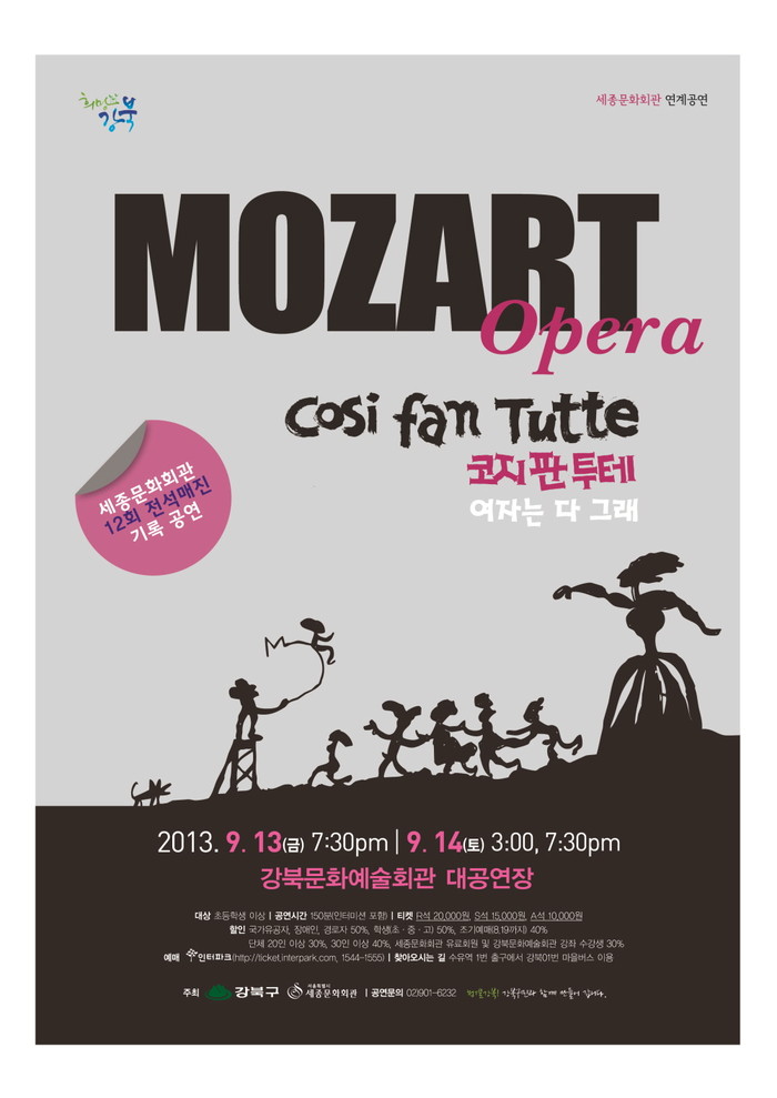 코지 판 투테는「선생님과 함께 노래를」「태권, 춤을 품다」에 이어 강북구가 세종문화회관과 연계하여 올리는 세 번째 작품으로 9월13일 19시 30분, 14일 15시 및 19시 30분 총 3회 공연된다.