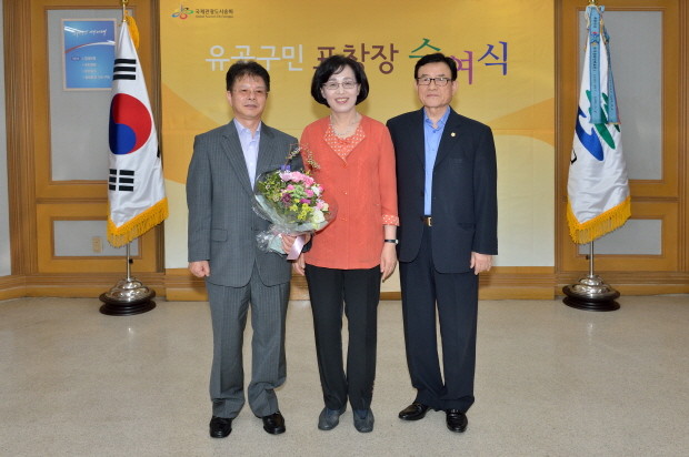 잠실7동 우성아파트 입주자대표회의는 27일 녹색실천운동으로 송파구가 세계적인 녹색환경도시로 인정받는데 기여한 공을 인정받아 송파구청장으로부터 환경사랑 분야 표창장을 수상하였다. 사진은 수상식 후 기념촬영 하고있는 모습.