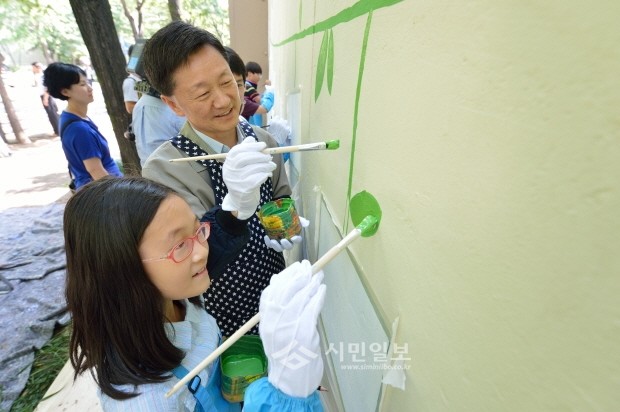 지난달 30일 양천구 양명초등학교는 콘크리트 옹벽에 학생들이 자신의 꿈과 소망을 담은 “안양천과 아이들”이란 주제로 벽화그리를 했다. 사진은 전귀권 양천구 구청장권한대행과 아이들이 꿈과 벽화를 잇는 넝쿨 그림 그리기를 하고 있는 모습.