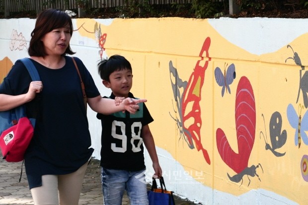 최근 강동구는 아파트 재건축 공사로 인해 썰렁해져 가는 마을의 미관을 살리고 낡고 칙칙한 골목길에 ‘어린이 필독서’를 주제로 재미있는 이야기 그림을 그려 생기와 활기를 불어넣는 벽화거리를 만들었다. 사진은 완성된 벽화거리로 등교하는 모자의 모습.