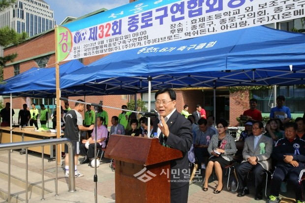 지난 1일 종로구의회는 효제초등학교 운동장에서 열린 제32회 종로구 연합회장기 생활체육 축구대회에 참석했다. 사진은 김복동 의장이 축구대회에 앞서 축사를 하고있는 모습.