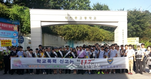 경기 용인동부경찰서는 개학을 맞아 지난 2일 용인시 태성중학교 등 14개 지구대·파출소의 권역별 중심학교를 선정하여 학교 정문에서 등굣길 학교폭력 예방 캠페인을 가졌다. 사진은 태성중·고등학교 앞에서 캠패인을 하는 모습.