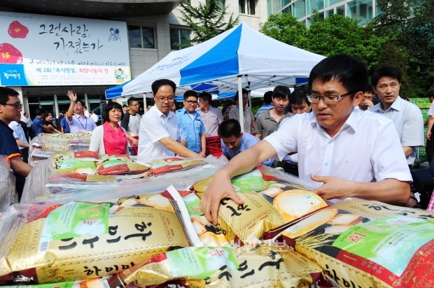 [시민일보]지난 4일 동대문구청 앞 광장에서 삼육재단과 동대문구가 함께 '추석명절 희망 나눔의 장' 행사를 열었다. 사진은 구청, 삼육재단의 직원들이 취약계층에서 나눠줄 쌀을 옮기고 있는 모습.