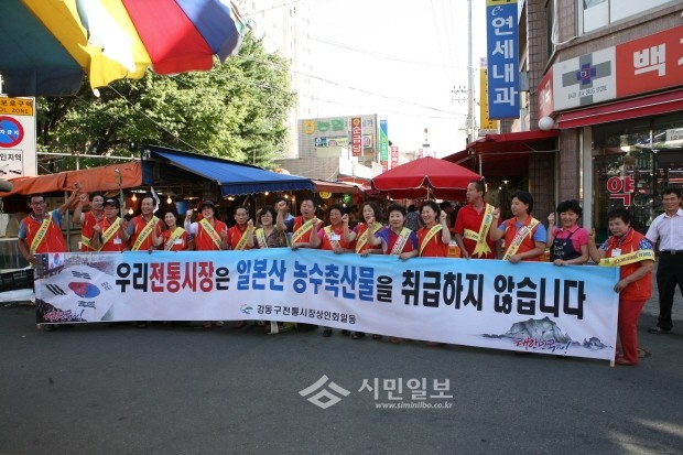 지난 3일 서울 강동구는 길동전통시장에서 일본에서 수입되는 농·수·축산물을 판매하지 않겠다는 자정결의대회를 했다. 사진은 상인연합회 김태진 회장 등 50여명의 회원들이 '우리 강동구 전통시장은 일본산 농·수·축산물을 판매하지 않습니다'라는 현수막을 들고 시장을 돌며 캠페인을 펼치는 모습.