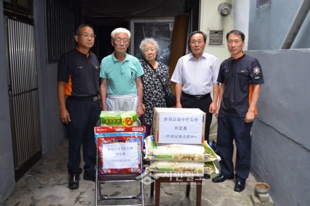 인천남동소방서는 지난 9일 지역내 화재로 인해, 주거 주택의 방과 거실 및 가재도구가 소실되면서 도움의 손길이 필요한 구월동의 한 노부부가정에 대응구조구급과장 및 직원 5명이 방문해 쌀과 생활필수품 등을 직접 전달했다. 사진은 위문품을 전달하고 기념촬영하고 있는 모습.