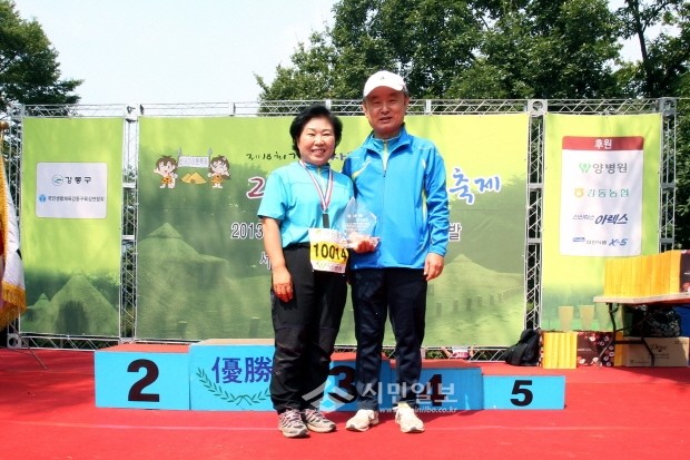 지난 8일 강동구의회 임춘희 의원이 암사동 유적지에서 열린 선사마라톤축제에 참여해 5km를 완주함으로써 육상 발전을 위해 노력한 공로로 강동구 육상연합회로부터 감사패를 받았다. 사진은 수여식 후 임춘희 구의원과 강동구 육상연합회 권경택 회장의 모습.