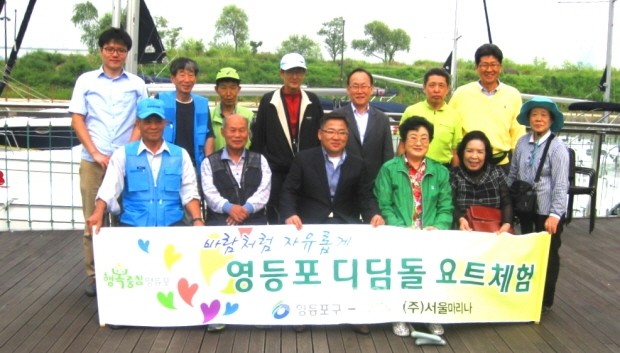 지난 9일 서울 영등포구 여의도 서울마리나클럽에서 저소득 주민 15명을 대상으로 무료 요트 승선 체험을 실시했다. 사진은 요트승선 체험 전 기념촬영을 하고 있는 참가자들의 모습.