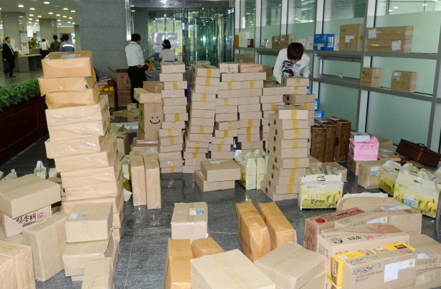 추석을 일주일여 앞둔 12일 서울 여의도 국회 의원회관 로비 한 켠에 각지에서 의원들에게 배달된 각종 선물이 쌓여 있다.