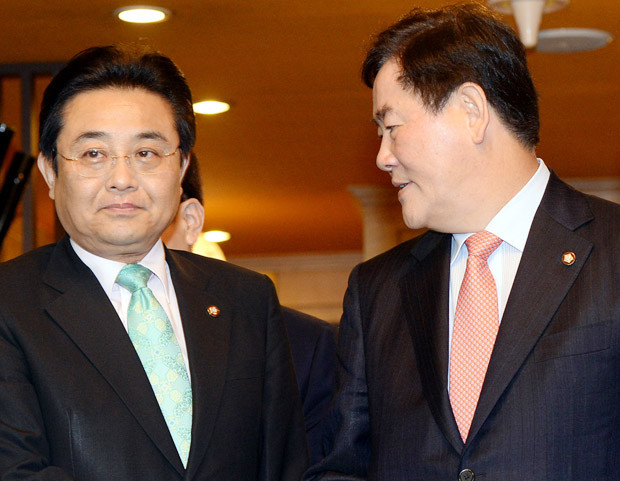 12일 오전 서울 여의도 한 호텔에서 여야 원내지도부가 국회 정상화 방안을 논의하기 위한 조찬회동을 하고 있다. 여야 원내대표가 한 테이블에 앉는 것은 지난 7월13일 이후 두 달 만이다. 왼쪽부터 전병헌 민주당 원내대표, 최경환 새누리당 원내대표.