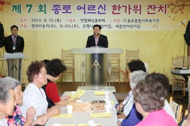 서울 종로구의회는 지난 12일 연합웨딩홀부페에서 한가위를 맞아 종로에 거주하시는 소외계층 노인 약 600여명을 대상으로 종로노인 한가위 잔치에 참석했다. 사진은 김복동 의원장이 한가위 잔치에서 축사를 하고있는 모습.