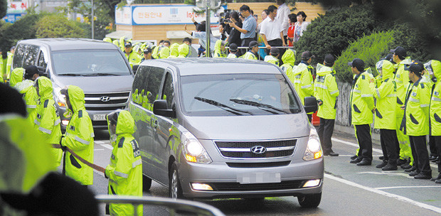 내란음모 혐의로 구속된 통합진보당 이석기 의원을 태운 차량이 13일 오후 경기 수원지검 별관 호송출장소로 들어서고 있다. 국정원은 이날 오후 수사기록과 이 의원 신병을 수원지검에 송치했다.