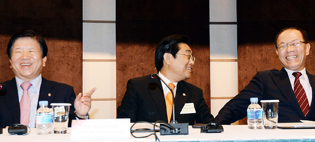 13일 오전 서울 중구 웨스틴조선 호텔에서 '아시아정당국제회의(ICAPP) 특별회의 개회식'이 열린 가운데 참석한 황우여 새누리당 대표(오른쪽)와 전병헌 민주당 원내대표가 만나 웃으며 이야기를 나누고 있다. 왼쪽은 박병석 민주당 의원.