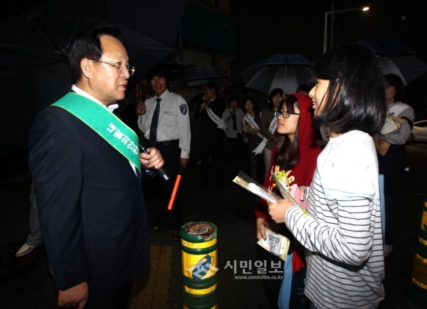 지난 12일 용인시(시장 김학규)가 여성친화도시 조성을 위해 기흥구청과 신갈오거리 일대에서 ‘맘(Mom)이 행복한 안전도시 용인 만들기’ 캠페인을 실시했다. 사진은 김학규 용인시장이 아이들에게 캠페인을 하고있는 모습.