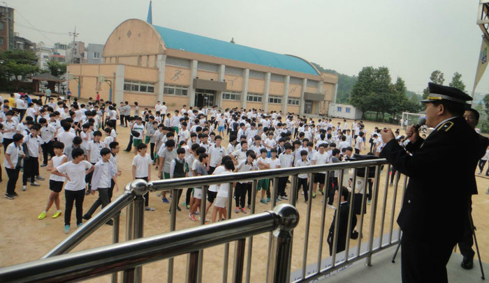 | ▲ 서부서 직원이 신현중학교 학생들을 대상으로 4대 사회악근절 홍보를 위한 퀴즈행사를 진행하고 있다. | ||