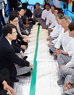 민주당 신경민, 우원식 최고위원 등 최고위원들이 16일 오전 서울광장에서 단식 농성 중인 쌍용차 범대위 관계자들을 격려 방문해 대화를 나누고 있다.