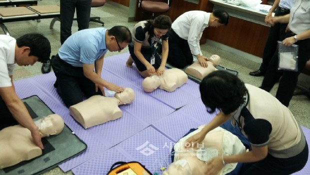 24일 인천 부평소방서 구급대는 농협중앙회 청천지점 지점장 등 20여명에게 생명존중 문화 확산 운동의 일환으로 심폐소생술 교육을 실시했다. 사진은 농협중앙회 청천지점 직원들이 심폐소생술 교육을 하고 있는 모습.