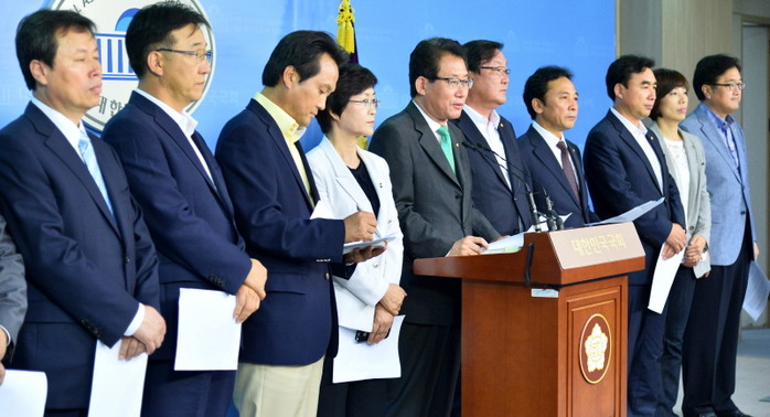 국회 교육문화체육관광위원회 유기홍 민주당 간사를 비롯한 야당 의원들이 24일 오후 서울 여의도 국회 정론관에서 유영익 국사편찬위원장 내정 철회를 촉구하는 기자회견을 하고 있다.