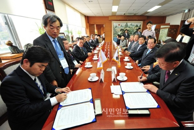 24일 김춘석 여주시장, 김규창 여주시 의회 의장 및 가미무라겐지 잔남정장, 다케히로 유헤이 상봉정장 등 진남정, 상봉정 축하사절단 20여명이 참석한 가운데 ‘상봉정 여주시 승격 기념 협정식’이 여주시장실에서 열렸다. 사진은 양 시·정 간의 관계를 더욱 활성화하기 위해 김춘석 여주시장(우)와 상봉정장 다케히로 유헤이(좌)가 교류증진 협정서를 작성하고 있는 모습.
