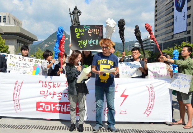 25일 오전 서울 종로구 세종로 광화문광장에서 열린 밀양 송전탑 공사 강행 반대 문화예술인 기자회견에서 참가자들이 기자회견문을 낭독하고 있다.