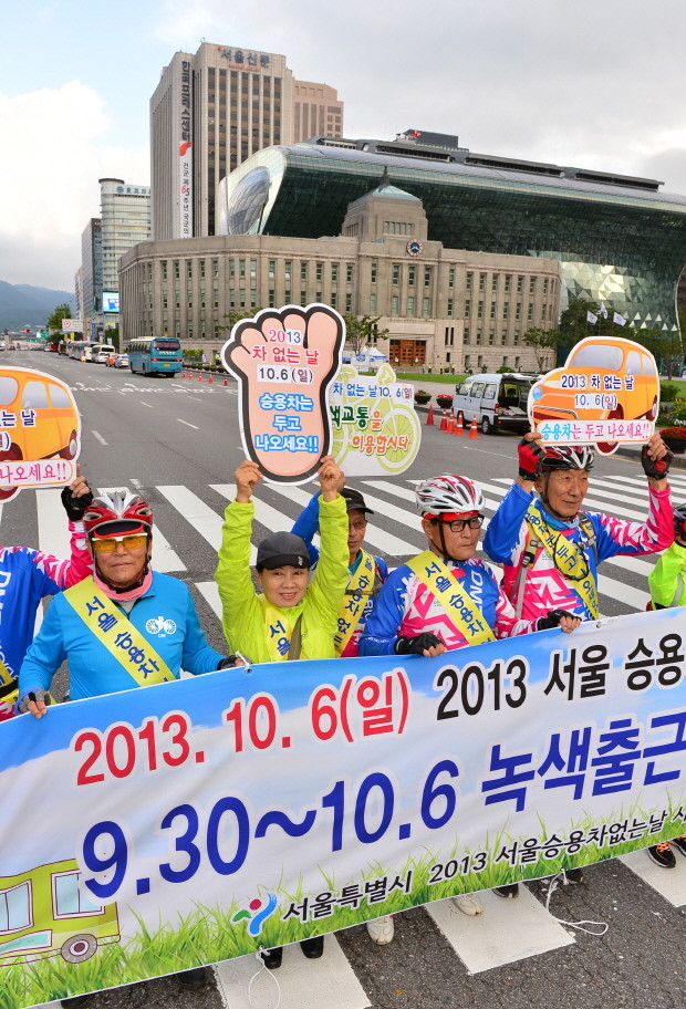 25일 오전 서울시청 광장에서 서울시 2013 서울승용차없는날 시민단체연대와 녹색자전거봉사단연합 회원들이 '2013 승용차 없는날(주간) 녹색출근캠페인'을 펼치고 있다.