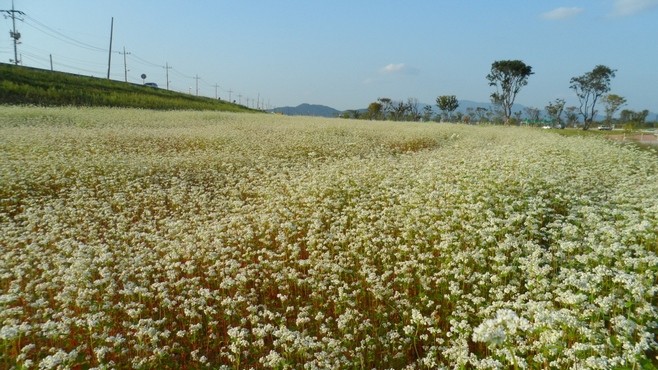 | ▲ 구미시가 낙동강 체육공원내 조성한 대규모 메밀꽃 단지. 2km에 걸쳐 흰색 꽃이 만개해 이곳을 찾는 시민들에게 볼거리를 제공하고 있다. | ||