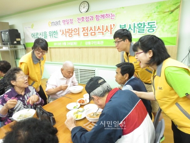 지난 24일 강동구민회관에서 이마트 명일점·천호점의 후원으로 '강동한마음봉사의 날' 행사와 함께 노인들을 위한 '사랑의 점심식사'행사가 열렸다. 사진은 봉사활동에 참여한 이마트 직원들이 배식봉사를 하고 있는 모습.