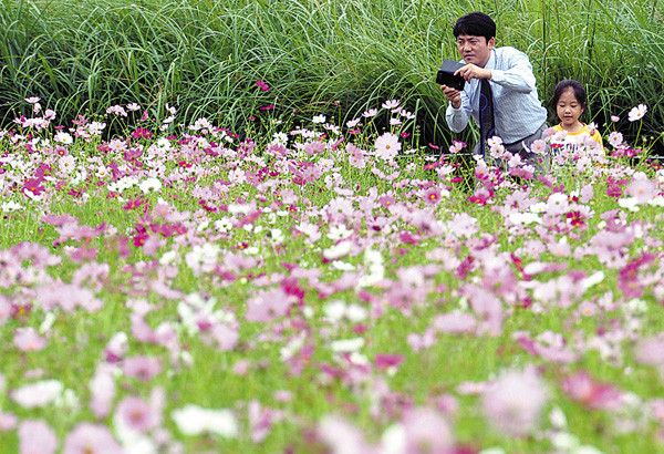 가을비가 잠시 소강상태로 접어든 29일 오후 서울 마포구 상암동 하늘공원을 찾은 시민들이 코스모스를 바라보며 가을의 정취를 만끽하고 있다.