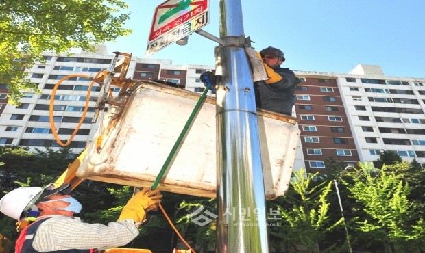 [시민일보]지난 26일 서울 송파구는 가을을 맞아 방이동 위례성길 일대의 올림픽로 외 8개 노선의 가로등 등주(기둥)와 등기구 세척을 실시했으며, 오는 30일까지 청소 완료예정이다. 사진은 가로등 청소모습.