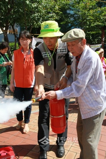 [시민일보]서울시 구로소방서는 지난 27일 구로근린공원에서 ‘아름다운 청춘 행복한 노년 제17회 노인의 날 기념 어르신 문화 한마당’과 연계하여 ‘구로소방서와 함께하는 소방안전체험’ 코너를 운영했다. 사진은 안전체험에 참가한 노인이 포그액 소화기를 활용한 소화기 관리요령 및 사용법 실습을 하고 있는 모습.