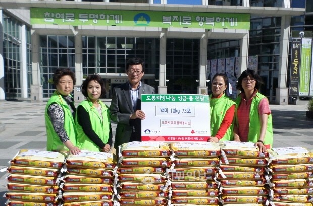 [시민일보]서울 도봉구 '도봉 사랑의 열매 봉사단'은 지난 26일 지하철 역사 모금 캠페인을 통해 확보한 성금으로 사랑의 쌀 73포(730kg)를 마련해 지역내 저소득층 구민들에게 전달했다. 사진은 구에 쌀을 기증한 후 기념촬영 하는 모습.