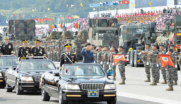 박근혜 대통령이 1일 경기 성남시 서울공항에서 열린 건군65주년 국군의날 기념식에 참석해 김관진 국방부 장관 중장 권태오 제병지휘관과 함께 열병하고 있다.