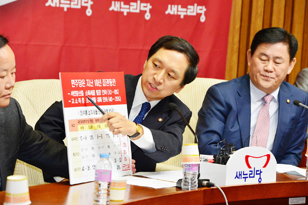 1일 오전 서울 여의도 국회 245호 회의실에서 열린 새누리당 원내대책회의에서 김기현 정책위의장이 세금공부하자며 소득세율 인하비교 도표를 들고 발언을 하고 있다.