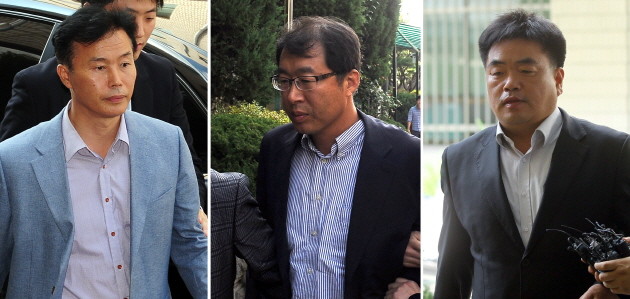 내란음모 등의 혐의로 사전구속영장이 청구된 조양원 사회동향연구소 대표, 김근래 통합진보당 경기도당 부위원장, 김홍열 통합진보당 경기도당 위원장(왼쪽부터)이 1일 오후 구속 전 피의자심문(영장실질심사)을 받기 위해 수원지법에 출석하고 있다.