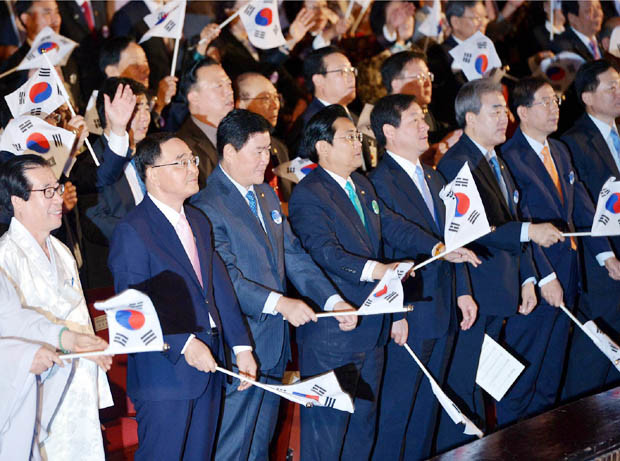 정홍원 국무총리와 최경환 새누리당 원내대표, 전병헌 민주당 원내대표 등 참석자들이 제4345주년 개천절인 3일 오전 서울 종로구 세종로 세종문화회관에서 열린 경축식에서 만세삼창을 하고 있다.