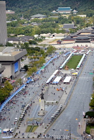 녹색교통주간의 마지막 날인 6일 오후 서울 종로구 세종로 광화문광장 옆 도로에서 '차 없는 날' 행사가 열리고 있다. 서울시는 '차 없는 날'인 6일 오전 7시부터 22시까지 광화문 삼거리에서 시청 앞까지 1.1km 공간을 '차 없는 거리'로 운영한다. 이날 거리 행사에서는 최신 전기차, 연료전지차, 이색자전거는 물론 국내 자동차 발전과정까지 볼 수 있다.