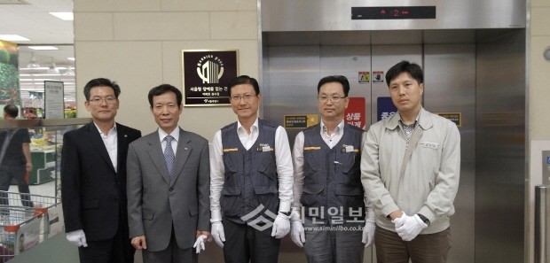 [시민일보]이마트 성수점이 승강기, 화장실, 주차장 등을 장애인 친화적으로 개선해 성동구 최초로 '서울형 장애물 없는 건물'로 인증받아 지난 4일 현판 제막식을 열었다. 사진은 김영갑 성동구 주민생활국장(왼쪽 두번째)과 전진홍 이마트 성수점 지점장(가운데)의 모습.