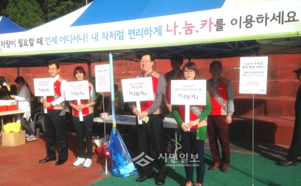 [시민일보]서울 강북구가 '제17회 강북구민의 날'을 맞아 열린 '2013 강북구민 한마음 체육대회'에서 대회에 참가한 주민들을 대상으로, 나눔카 사업 활성화를 위해 홍보활동을 했다. 사진은 나눔카 홍보부스 앞에서 피켓 홍보 중인 모습.
