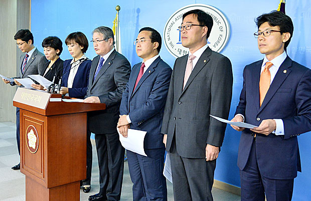 7일 오전 서울 여의도 국회 정론관에서 민주당 초선 의원들이 손학규 상임고문의 경기도 화성갑 재보선 출마를 촉구하는 기자회견을 하고 있다. 손학규 상임고문은 이날 김한길 대표에게 불출마 의사를 최종 통보했다.