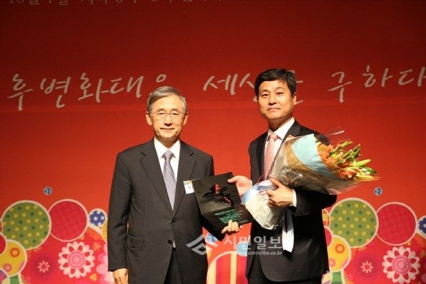 지난 7일 성북구가 주민절전소·절전왕 선발대회 실시 등 에너지 사용량과 온실가스를 줄이기 위한 사업을 해 온 공로로 '2013 기후변화 그랜드 리더스 어워드' 시상식에서 지방자치단체부문 수상자로 선정됐다. 사진은 시상 후 기념촬영을 한 기후변화센터 이장무 이사장(좌)과 김영배 성북구청장(우).