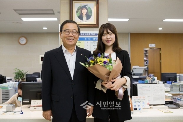 경기 구미시는 지난 8일 민원업무 및 전화 민원에서 항상 친절하고 밝은얼굴로 상담을 해 온 김보경 주무관을 2013년 3분기 구미시 종합민원실 스마일 왕으로 선정했다. 사진은 남유진 구미시장과 김보경 주무관이 기념촬영하는 모습.