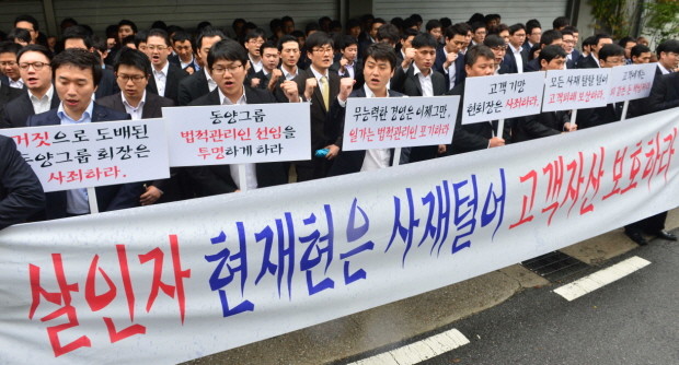 | ▲ 동양증권 노동조합 회원들이 8일 오후 서울 성북구 성북동 현재현 동양그룹 회장 자택 앞에서 현재현 동양그룹 회장의 사죄와 보상을 요구하는 내용의 피켓을 들고 구호를 외치고 있다. | ||