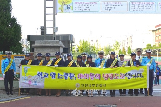 [시민일보]인천남부경찰서(서장 안정균)는 10일 남구 학익동 인주초등학교 앞 어린이 보호구역내에서 남부경찰서, 녹색어머니회, 모범운전자회, 교사, 인주초 학생이 안전한 스쿨존 장착을 위한 교통캠페인을 펼쳤다. 사진은 인주초등학교 앞에서 캠페인을 펼치고 있는 모습.