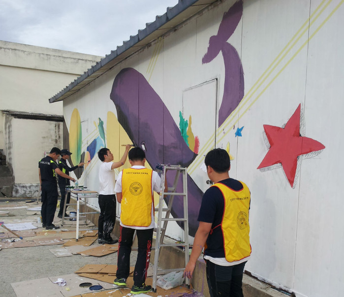 | ▲ 강화경찰서가 마련한 인천117 희망벽화 행사에 참여한 관계자들이 벽화 그리기 작업을 하고 있다. | ||