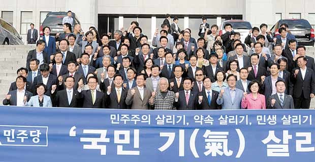 11일 오전 민주당 국정감사 출정식이 열린 서울 여의도 국회 본관 앞 계단에서 김한길 대표와 전병헌 원내대표, 의원들이 구호를 외치고 있다.