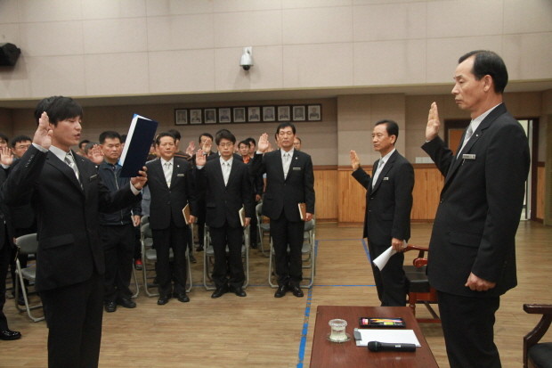 서울 구로소방서는 지난 11일 최근 발생하고 있는 소방공무원의 안전사고와 관련해 화재·구조·구급활동 등 최일선에서 활동하는 소방대원의 안전사고가 재발하지 않도록 예방하기 위해 ‘무사고 365일 실천결의대회’를 열었다. 사진은 구로소방서 대원들이 선서식을 하는 모습.